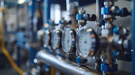 Close-up view of industrial gauges and pipes, showcasing precision instruments for measuring and monitoring pressure in a factory environment.