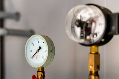Closeup of manometer, measuring gas pressure. Pipes and valves on the background. Selective focus.