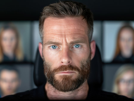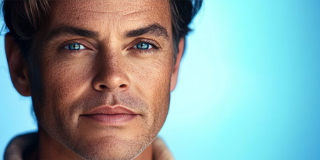 A man with a beard and blue eyes. He has a serious look on his face. Concept of confidence and masculinity