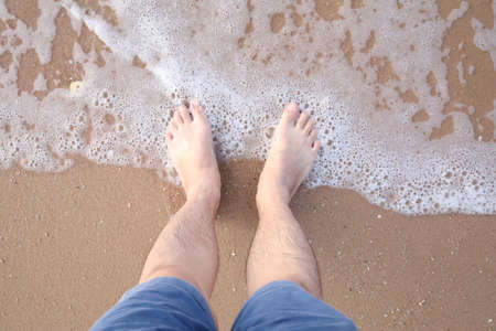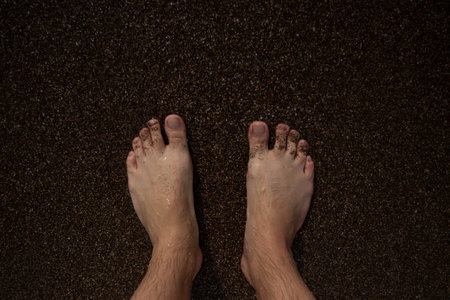 Two bare feet in sand particles, separately, one fragment, against the background of the blurred sea, on a pebble beach.
