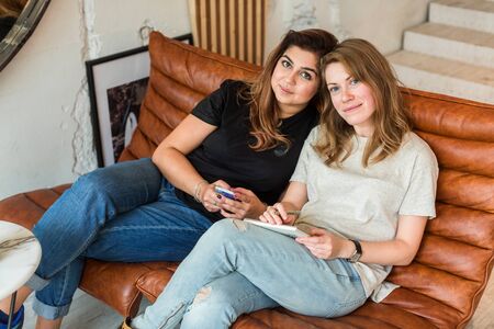 Young couple of girls rest together. Sisters, family, friendship relationships concept