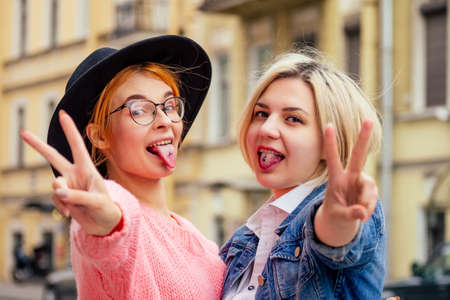 Outdoor portrait of two stylishly dressed, beautiful girls and very happy. Girlfriends walking and it is very fun.