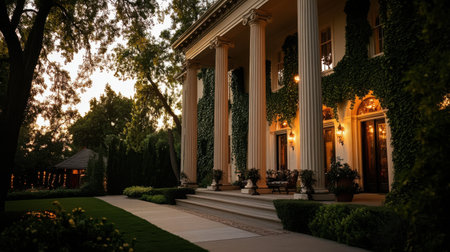Beautiful mansion with tall pillars and a sprawling garden, offering ample space for text overlay.