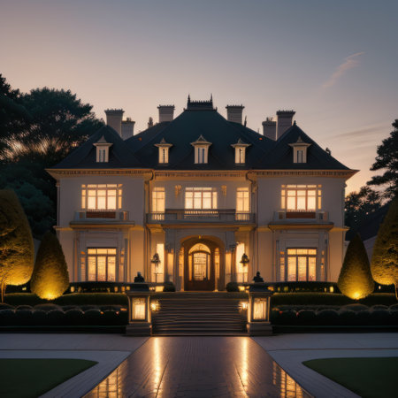a stately mansion with illuminated casting warm light onto the surrounding