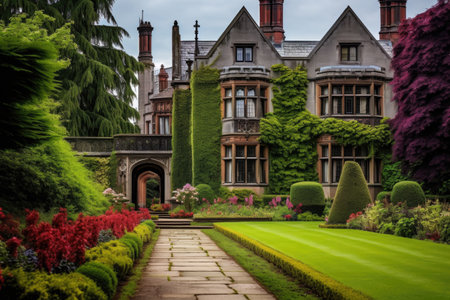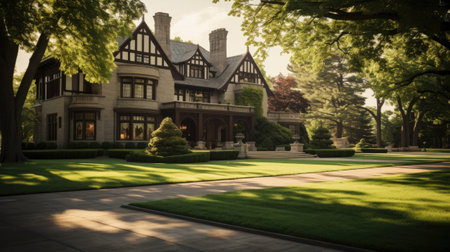 exterior of classic tudor house, with rolling green lawn and majestic trees in the background, created with generative ai