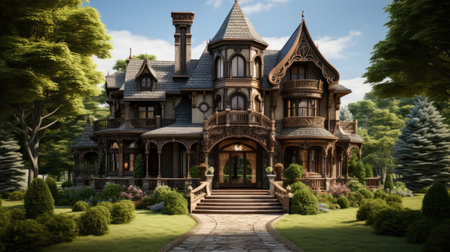 Home architecture design in Gothic Revival Style with Pointed arches constructed by Stone and wood material. Victorian grandeur. Generative AI AIG25 .