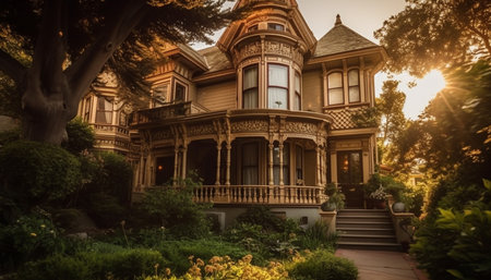 Luxury residential building illuminated by sunset, surrounded by nature generated by artificial intelligence