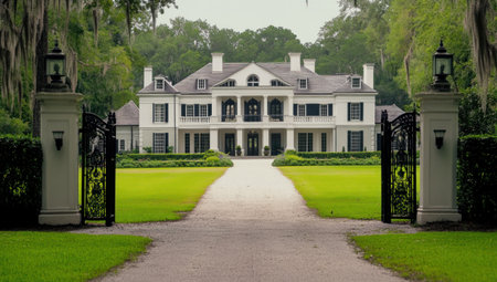 iron gates, with intricate scrollwork and filigree, leading to stately mansion, created with generative ai