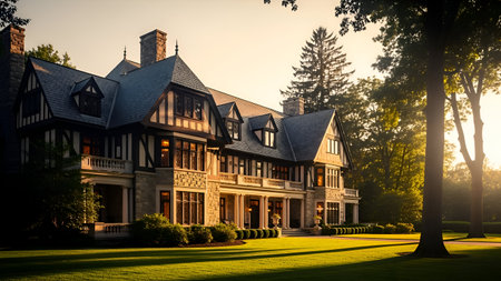 A grand Tudor-style mansion stands majestically amidst a well-manicured lawn and tall trees. The house features dark wooden beams, steeply pitched roofs, and multiple chimneys. Warm sunlight casts a golden glow over the scene, enhancing the mansion's historic charm and serene ambiance.