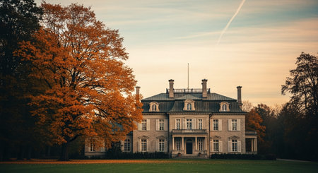 Beautiful mansion in autumn park. Autumn landscape with colorful trees.