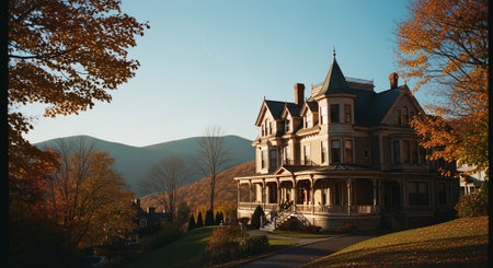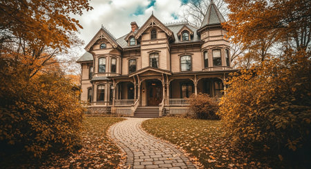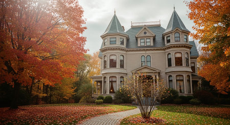 This image features a charming vintage house enveloped by vibrant autumn foliage, showcasing a picturesque garden and serene pathway, highlighting seasonal beauty.