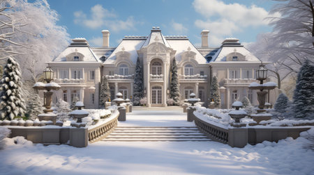 Luxurious mansion exterior with elegant architecture and landscaping