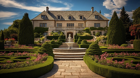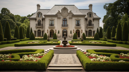 A formal garden with rows of blooming flowers leading to a classic French house, ideal for serene scenes.