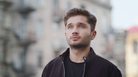 Pensive hipster guy waiting for call to mobile phone on city street. Closeup young man looking cellphone screen in urban background. Portrait of thoughtful man using smartphone outdoors.