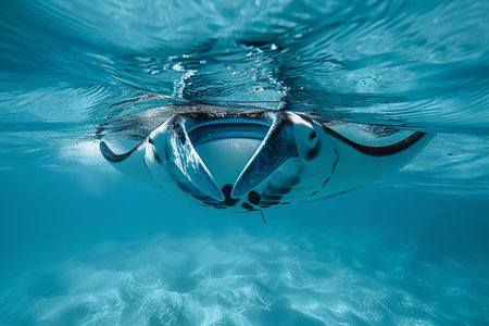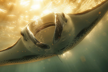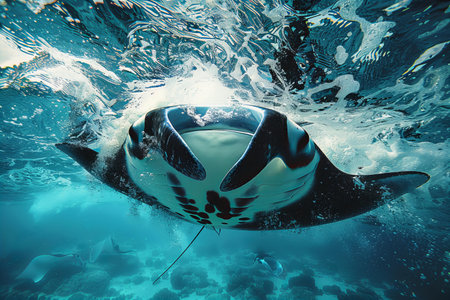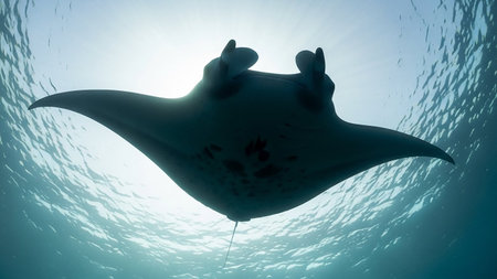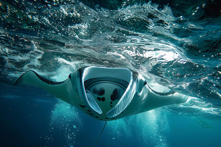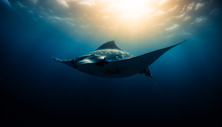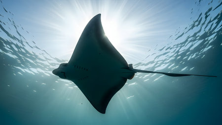 A stunning image of a manta ray gracefully swimming beneath the ocean surface, illuminated by sunlight, showcasing the beauty of marine life in a tranquil environment.
