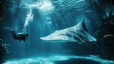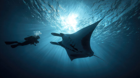 A captivating underwater scene featuring a majestic manta ray gliding gracefully beneath stunning rays of sunlight, with a diver exploring the depths.