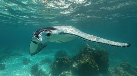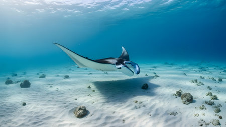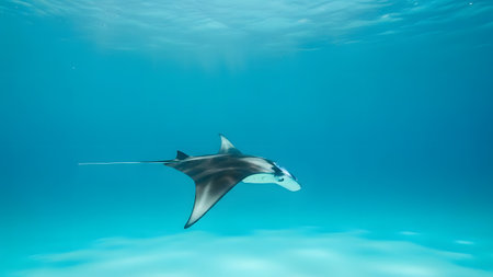 A stunning stingray gracefully glides through clear ocean waters, capturing the serenity and beauty of marine life in its natural habitat. Perfect for nature lovers.