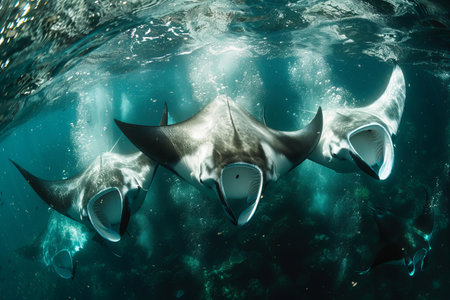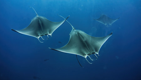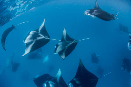 School of manta rays swimming in the clear blue ocean water