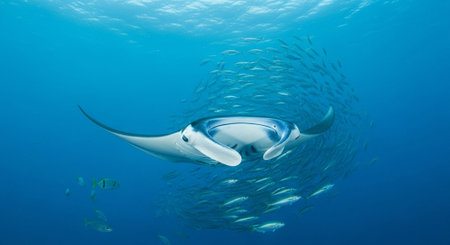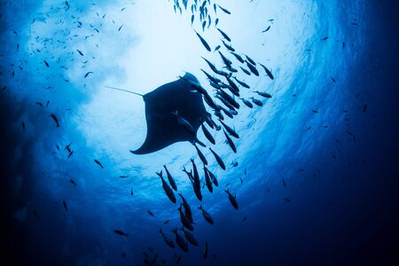 Beautiful Manta ray swimming in the deep blue ocean with lots of fish around.