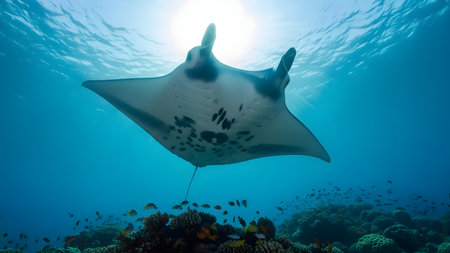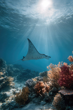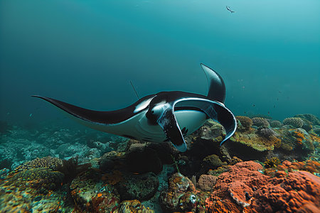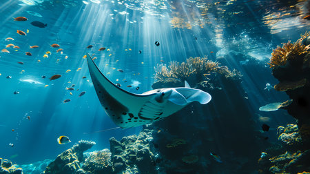 A stunning manta ray gliding gracefully over a vibrant coral reef, showcasing the beauty of underwater life and the serenity of the ocean ecosystem.