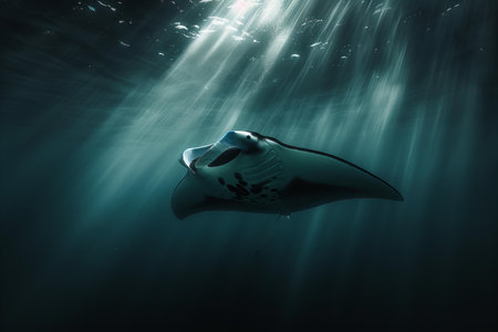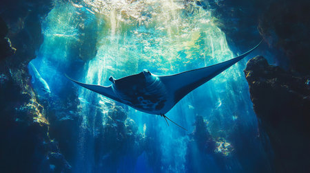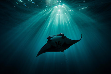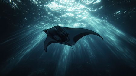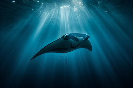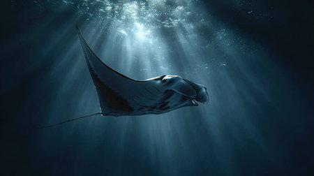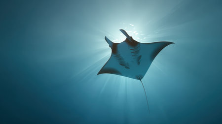 A majestic manta ray swims gracefully through the tranquil blue waters, illuminated by beams of sunlight, showcasing the beauty of marine life.