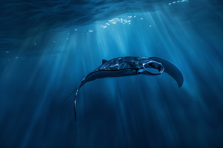 Manta ray swimming underwater in deep blue ocean with rays of light