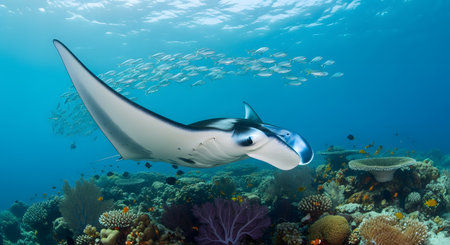 Giant oceanic manta ray is swimming peacefully over a colorful coral reef, surrounded by a school of vibrant tropical fish, creating a breathtaking underwater scene