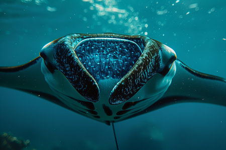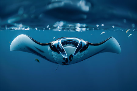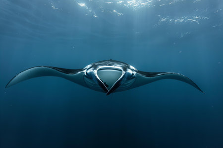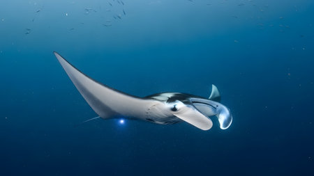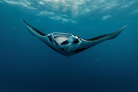Elegant manta Ray floats under water. Giant ocean Stingray feeds on plankton. Marine life underwater in blue ocean. Observation of animal world. Scuba diving adventure in sea of Cortez, coast Mexico