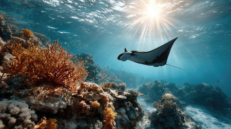 A majestic manta ray glides gracefully through the blue ocean water above a colorful coral reef. The sun shines brightly from the surface, casting rays of light down onto the marine life and creating a breathtaking underwater scene.