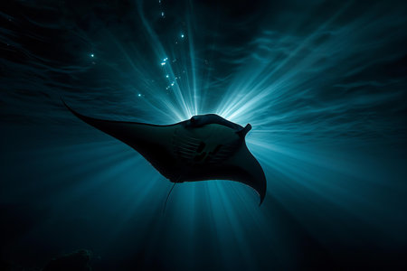 Manta ray in the deep blue ocean with rays of light.