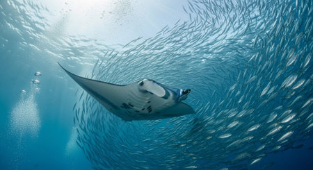 A majestic manta ray glides through clear blue ocean water, just above a vibrant and healthy coral reef. A large school of silver fish swims in the background, illuminated by sunlight from the surface. This image captures the beauty of marine life and underwater ecosystems.