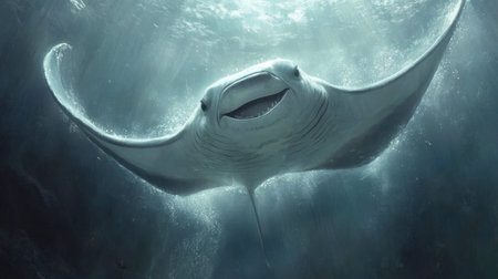 A stunning manta ray gracefully glides through crystal-clear ocean waters, illuminated by sunbeams, showcasing the beauty of marine life and the tranquility of underwater exploration.