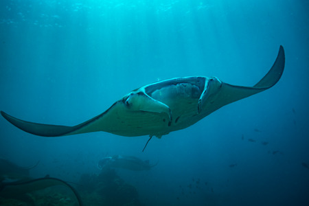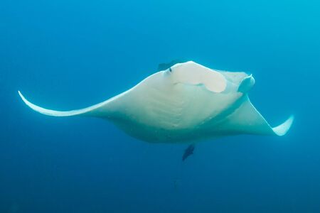 Manta ray swimming freely in open ocean. Giant manta ray floating underwater in the tropical ocean