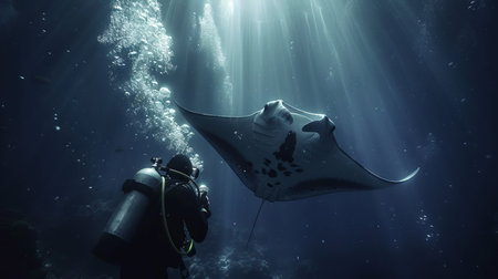 A mesmerizing scene featuring a diver and a graceful manta ray gliding through a vibrant underwater world, illuminated by soft light rays.