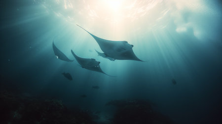 A school of manta rays gracefully swimming through the clear waters of the Maldives, with rays of sunlight filtering through the ocean.