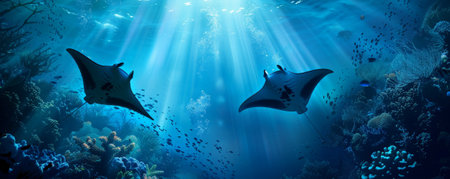 Underwater background with large, graceful manta rays gliding in open water.