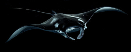 A majestic manta ray gliding effortlessly through the water on a black background. The wide, sweeping motions of its fins create a sense of grace and elegance as it moves through the dark waters.
