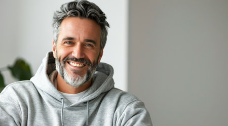 A smiling man wearing a small hoop earring for lifestyle and having short hair