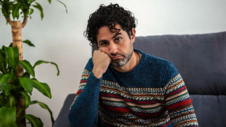 Portrait of handsome man wearing a winter sweater and feeling exhausted on a couch at home. Frustrated caucasian man holding head on hand and sitting on sofa of house.