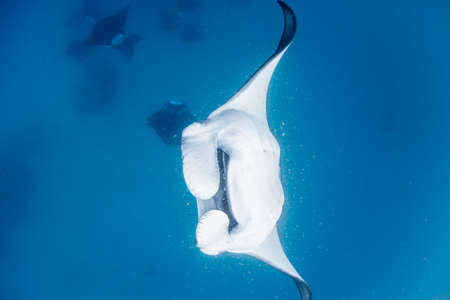 Underwater view of hovering Giant oceanic manta ray ( Manta Birostris ). Watching undersea world during adventure snorkeling tour to Manta Beach in tropical Nusa Penida island, Indonesia.