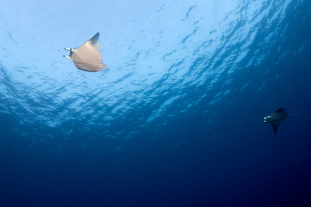 Two eagle ray Myliobatidae with his wing fully opened and flying in sea depth