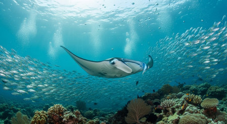 Underwater image of big ray swimming next to big school of fishes in ocean