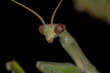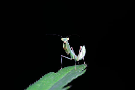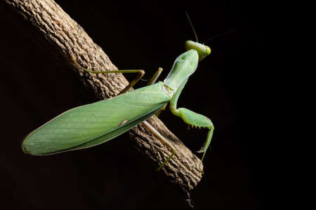 Close-up macro of a green praying mantis climbing a plant stalk, isolated on black background in studio light.