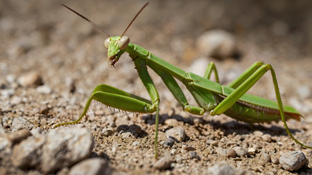 A vividly detailed praying mantis, with piercing eyes, poised elegantly as it surveys its surroundings.