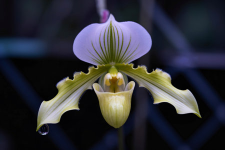 A close-up macro shot of a beautiful Lady Slipper orchid in bloom. The flower features delicate white and green petals, with a single water droplet clinging to one petal.