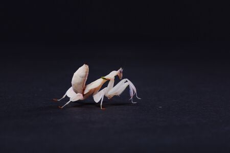 Young white orchid mantis, Hymenopus coronatus, in front of black