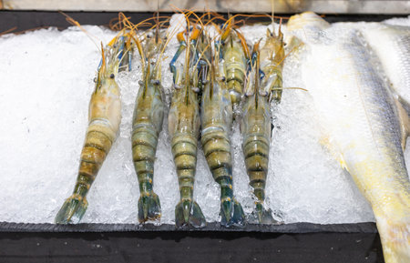 Feresh tiger prawn shrimp sell in fishery market close up seafood