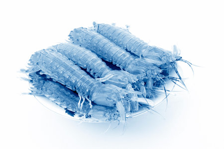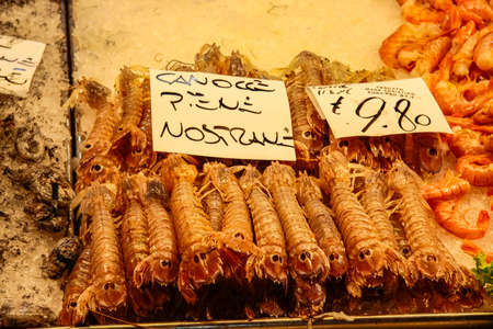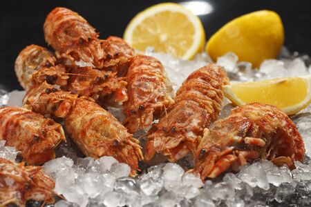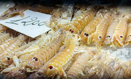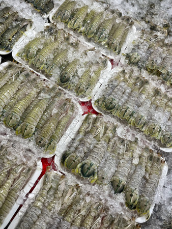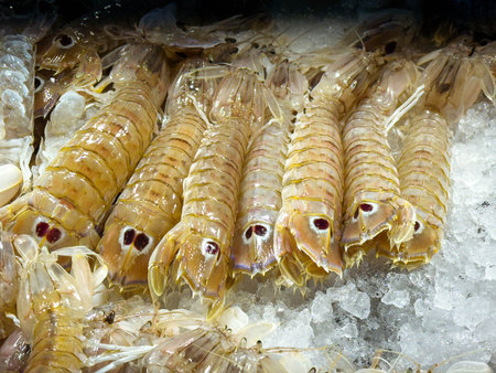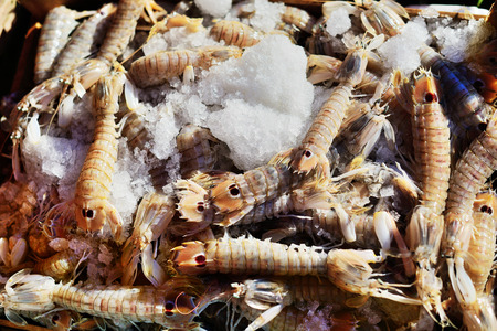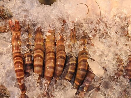 Fresh mantis shrimp or adriatic prawns (Squilla mantis) with ice crystals on fish market. Food background.