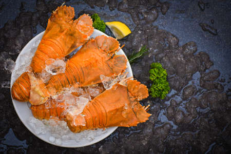 Flathead lobster shrimps on ice, fresh slipper lobster flathead boiled for cooking on white plate lemon parsley in the seafood restaurant kitchen or seafood market, Rock Lobster Moreton Bay Bug