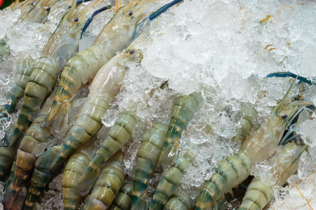 Fresh shrimp on ice for sale at the fish market in Thailand.